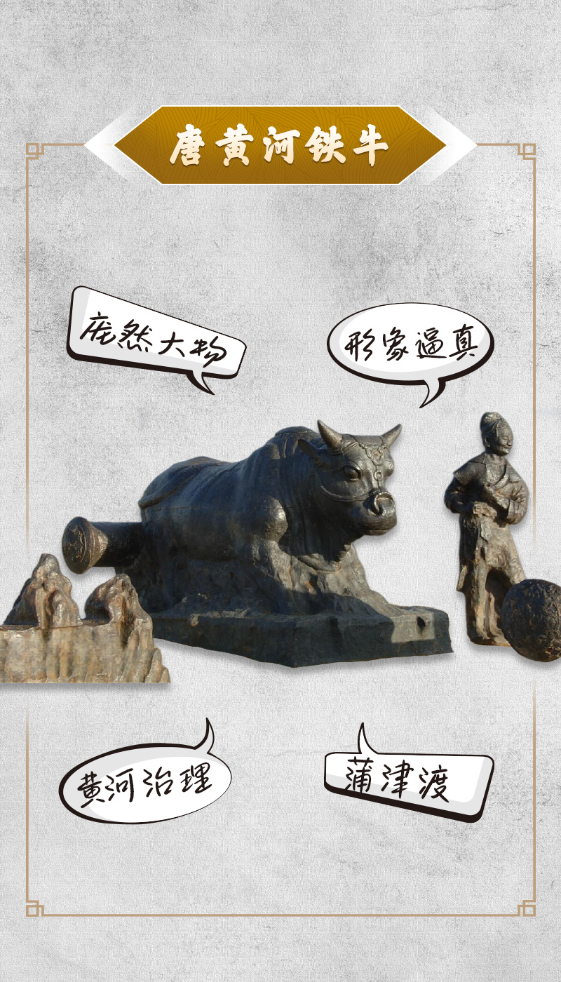 唐黄河铁牛现位于山西永济黄河古道两岸,共四尊。铁牛铸于唐开元十三年(公元725年),以稳固蒲津浮桥,维系秦晋交通。元末桥毁,久置不用,后因黄河河道变迁,铁牛没入水中,1989年重现于世。铁牛分为两组,两牛一组,呈前后排列姿态,面朝西方。铁牛每尊高约1.9米,长约3米,宽约1.3米。牛尾后有横轴,用于拴连桥索,轴头有纹饰,各轴不同,分别有连珠饰、菱花、卷草、莲花等。牛侧均有一铁铸高鼻深目胡人作牵引状,四牛四人形态各异,大小基本相同,据测算,铁牛各重约30吨,加之下方的底盘和铁柱,各重约70吨。