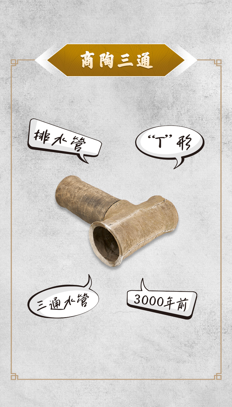 商陶三通现藏于中国社会科学院考古研究所,为三接口的“T”形陶制水管,1972年出土于河南安阳白家坟村西地。出土时,三通水管的南北向水管保存17节,全长7.9米,东西向保存水管11节,全长4.62米。水管每节长42厘米,管外径21.3厘米。东西向水管交接处,有一个三通水管,表明3000多年前铺设的地下排水管已形成网络分支。