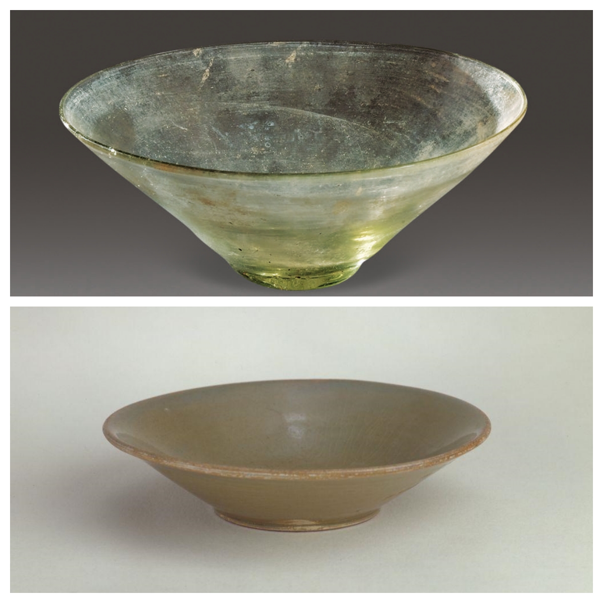 素面淡黄色琉璃茶碗(上)与故宫博物院藏唐代青釉玉璧形底碗(下)