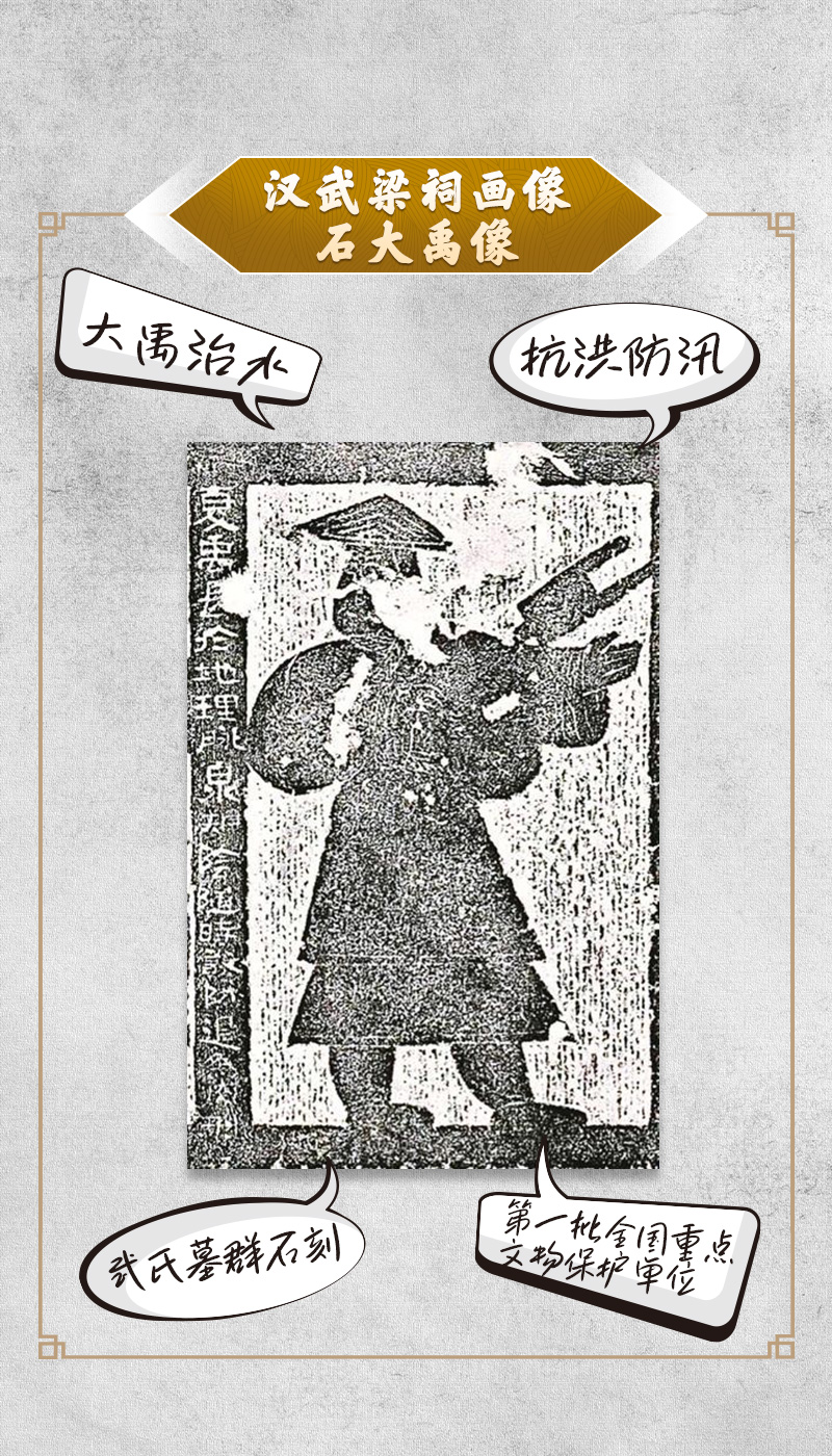 武梁祠画像石是山东嘉祥“武氏墓群石刻”中的一部分,画像内容多取自古代传说及史籍。在其中一幅画面上,大禹头戴斗笠,身穿宽袖衣和裳,左手前伸,右手执耜,回首顾望。左侧榜题为:“夏禹长于地理,脉泉知阴,随时设防,退为肉刑。”武氏墓群石刻的立石时间为东汉元嘉元年(公元151年),出土时间为清乾隆五十一年(公元1786年),1961年被国务院公布为第一批全国重点文物保护单位。
