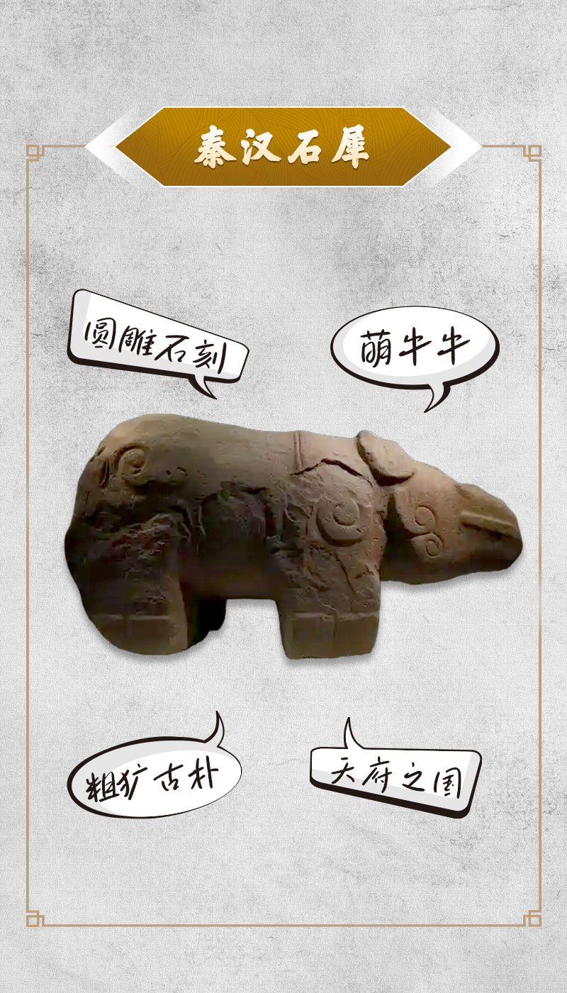 秦汉石犀现藏于成都博物馆。1973年,该石犀在成都天府广场附近首次发现,但由于当时挖掘技术不足、保护条件有限而被填回。直到2012年12月,石犀才得以“重见天日”。石犀长3.3米,宽1.2米,高1.7米,重达8.5吨。