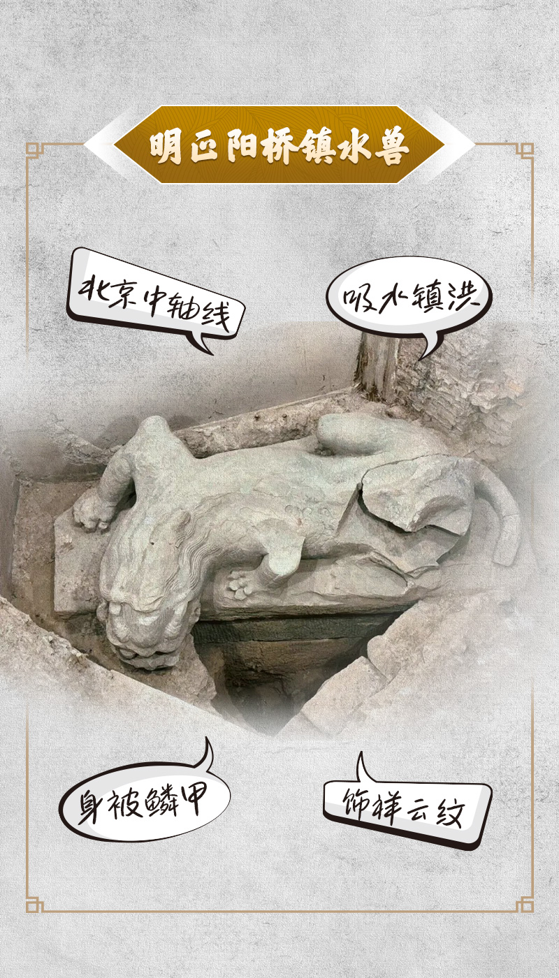 明正阳桥镇水兽现位于北京正阳门箭楼之南的正阳桥遗址考古方舱。镇水兽用花岗岩雕刻而成,俯卧在雁翅石条上,形态浑厚大气,造型逼真;头朝东南,俯向水面一侧,尾向西北,略弯曲,身被鳞甲,局部饰祥云纹;距现状地表深2.5米,长3米,宽1.4米,高48厘米。兽首前倾约12度,前倾造型形成高效导流面,洪水冲击压强模拟测试显示减阻率达17%。镇水兽的发现,有助于了解正阳桥的地理方位,对研究北京城护城河及防御、水利、交通体系具有重要作用。